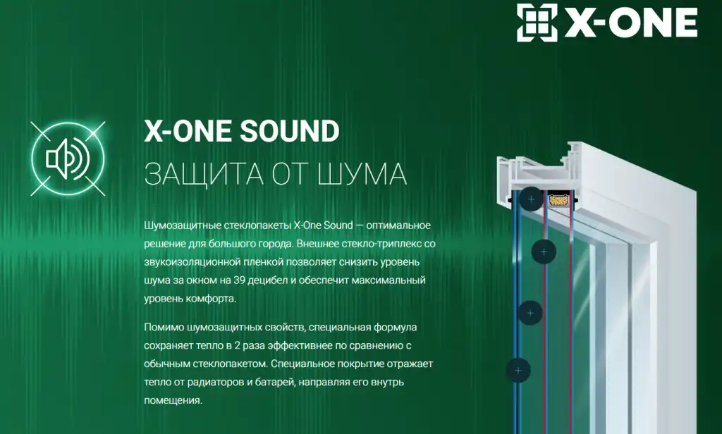 Недавно нам удалось отыскать окна, которые прямо были предназначены для шумных городов. Это были окна со сверхспособностями X-ONE от X-one.glass. Окна X-ONE бывают разных моделей. Сами оконные профили в их одинаковые, а вот стеклопакеты бывают разными. Нас заинтересовали конкретно шумозащитные стеклопакеты X-ONE SOUND. Их особенности:
